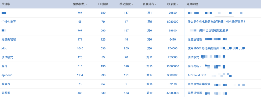 关键词词表分析:除了首页排名外,【个性化推荐】这个百度指数130的词,排名在首页第五位,是博客内页,网站博客的内容运营在行业中做的相当有竞争力。