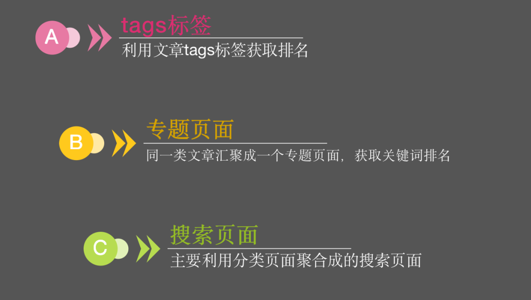 聚合同一类文章,利用tags标签或者专题页聚合站内文章,在专题页或者tags标签中布局关键词。