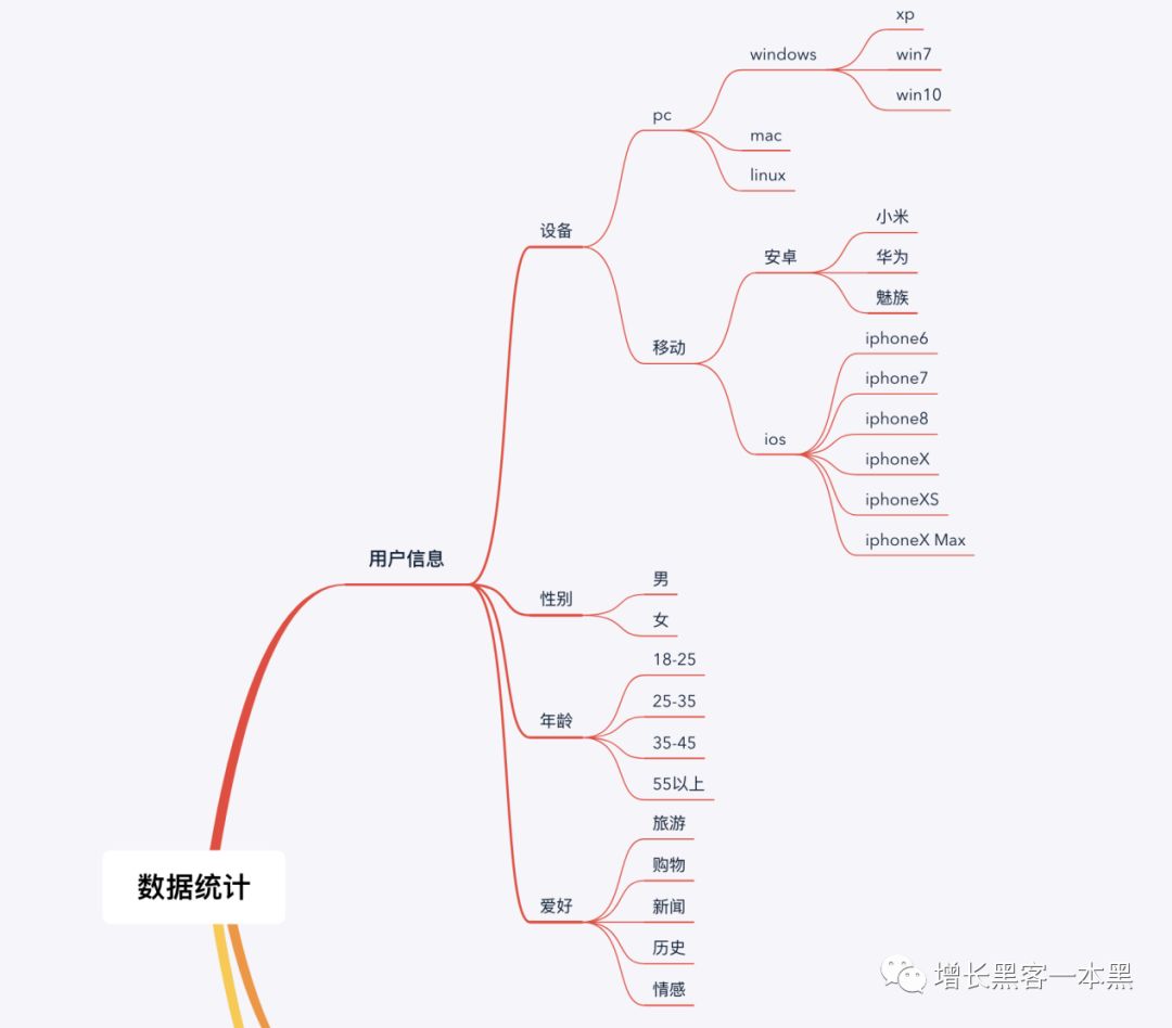 理想状态:一般会收集用户的设备,年龄段,地域,爱好这个属于四个基本的数据。每个数据又可以拆开来收集:比如设备可以区分pc和移动,拿到这些信息又可以细分。