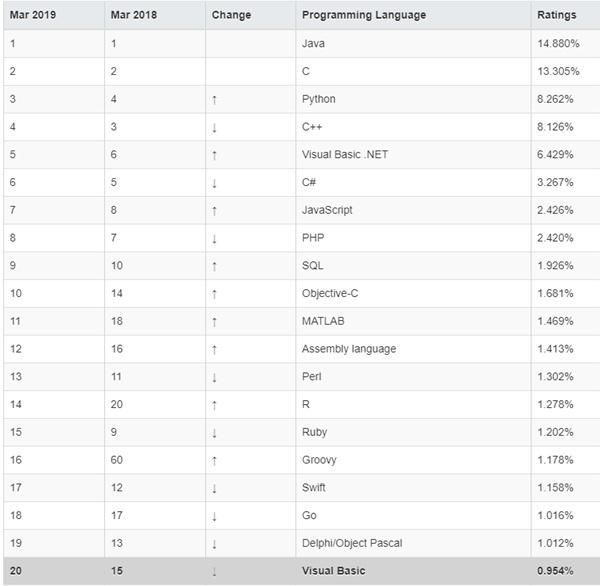2019年3月份编程语言排行榜