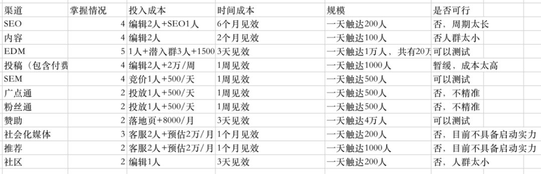 第一轮筛选出来的渠道有:EDM、SEM、赞助、付费投稿